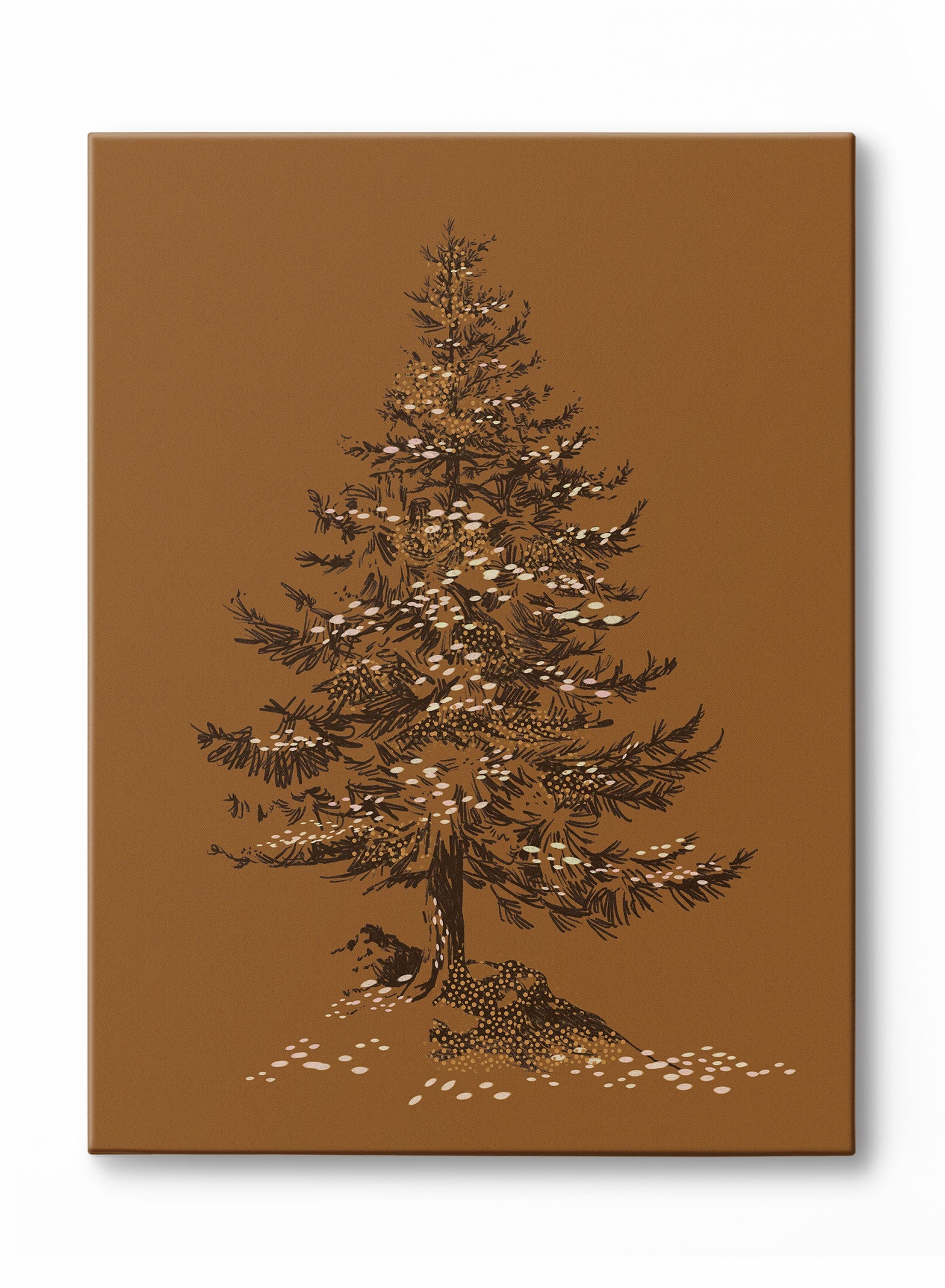 This print features a solitary evergreen tree, intricately detailed against a rich, earthy brown background. The tree's branches are adorned with delicate, scattered leaves, creating a sense of gentle movement. The overall composition is both serene and striking, capturing the quiet beauty of nature in a minimalist style.