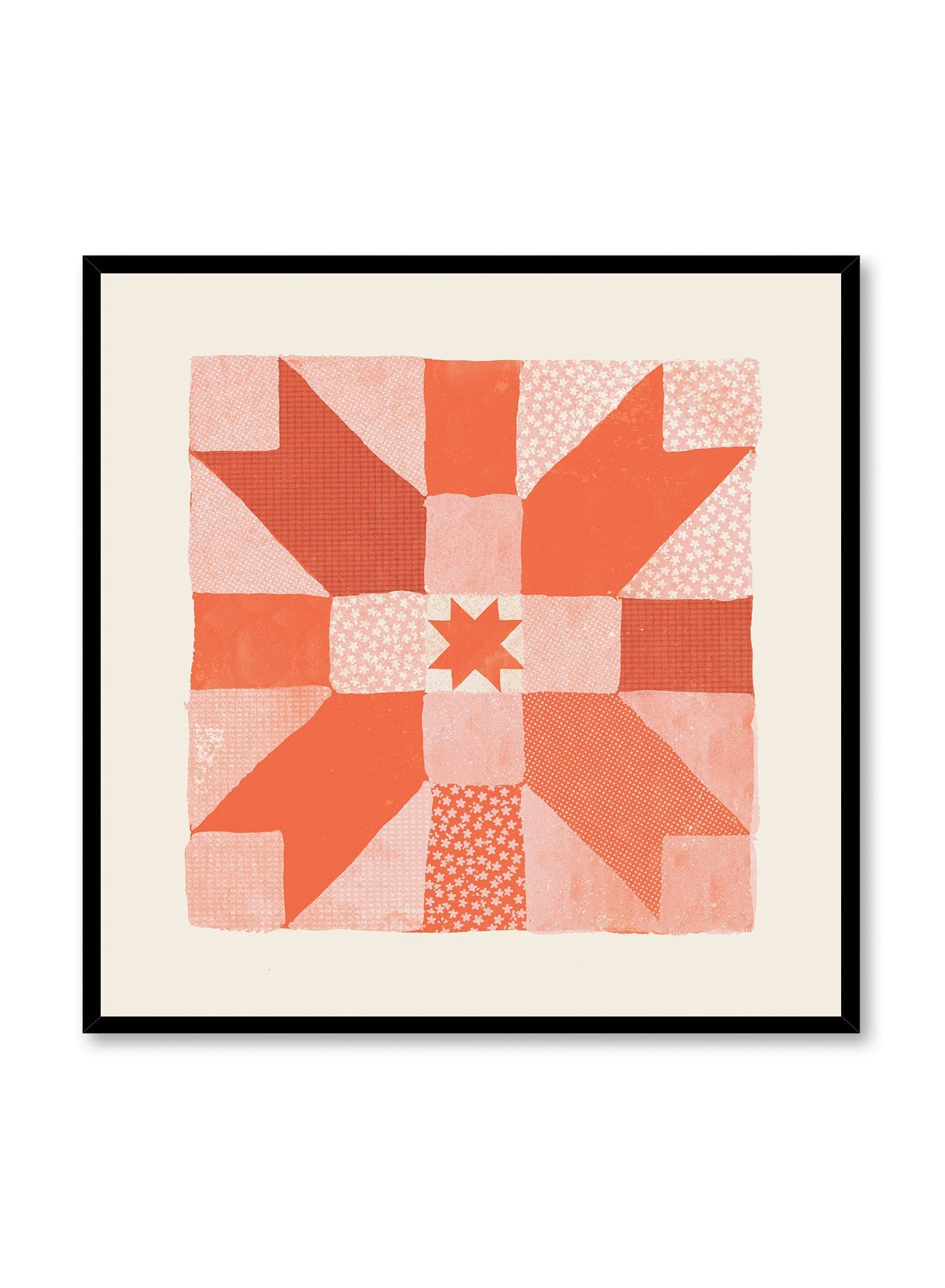 This print features a geometric pattern with a central star motif, surrounded by bold, angular shapes. The design is composed of various shades of red and pink, creating a striking contrast against the cream background. The texture appears quilt-like, with subtle variations in pattern and tone adding depth and interest.