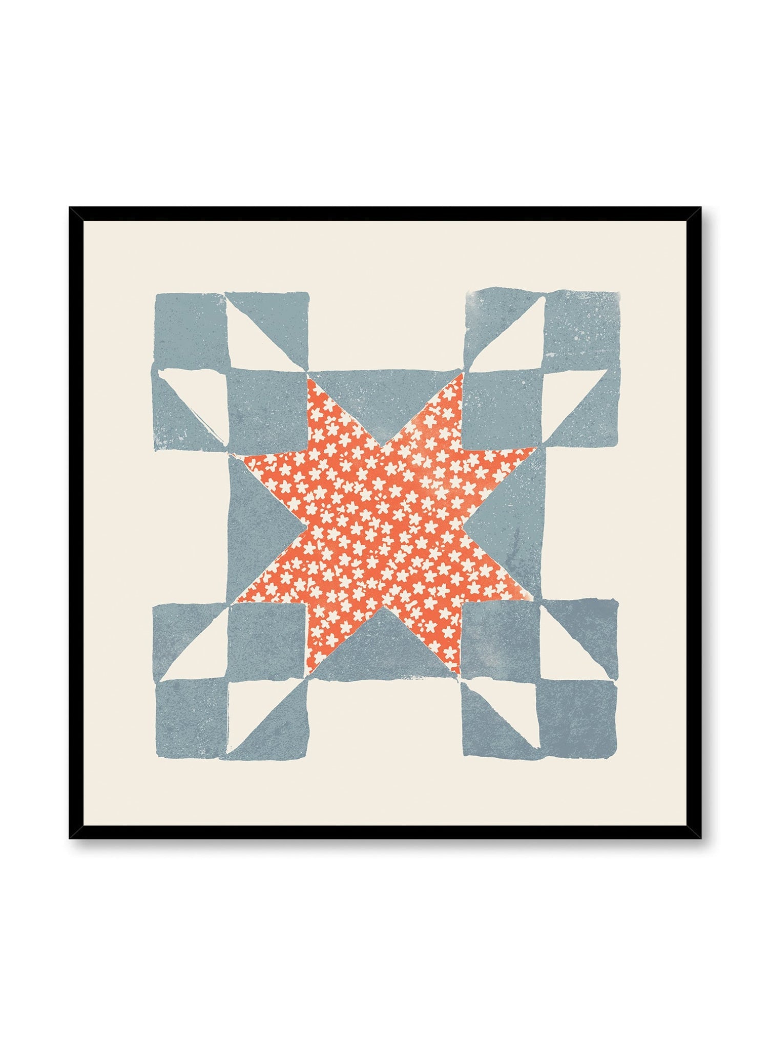 This print features a striking geometric design, where a central red star, adorned with a pattern of small white flowers, commands attention. Surrounding the star, a series of blue and white triangles create a dynamic border, adding depth and contrast to the composition. The background is a soft cream, allowing the vivid colors to stand out.